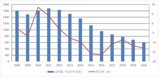 2020年报纸印量持续下滑,降幅进一步扩大。